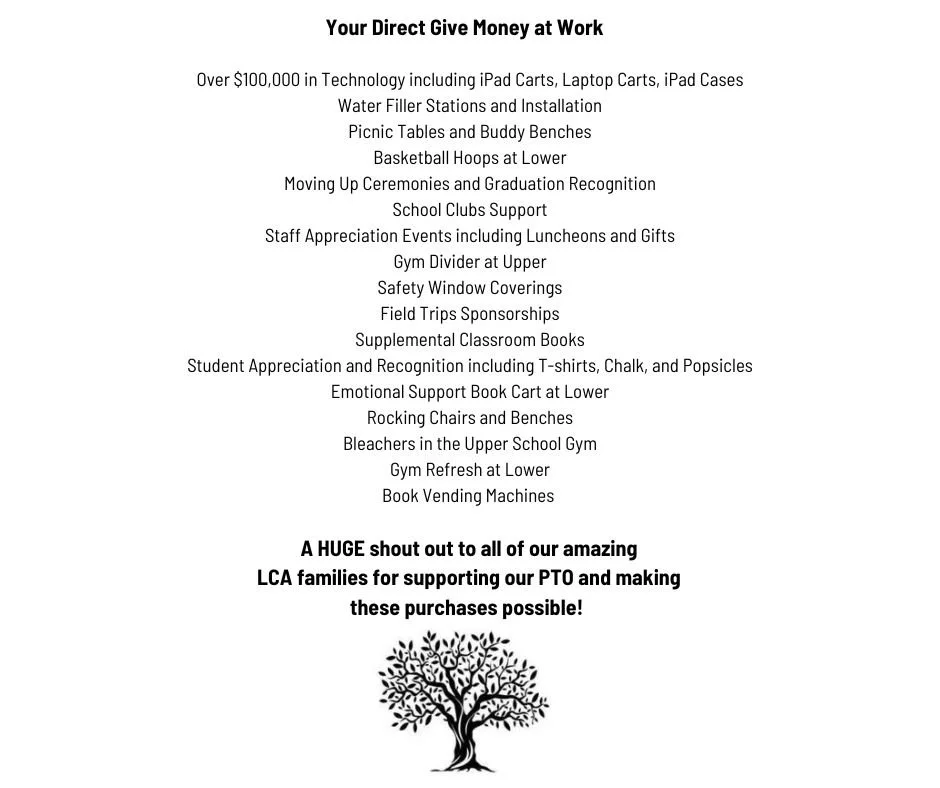No one likes to go door to door bothering family, friends, and neighbors selling magazine, cookies, coupon books, etc. Our Direct Give campaign has saved us the past 6 years from doing just that! Both campuses have a wish lists the PTO wants to fulfill and with your help we can do it! We have fun planned for the students for each benchmark we hit and prizes along the way too. Our goal is 100% participation, we have levels for every budget and whatever you can give is appreciated!